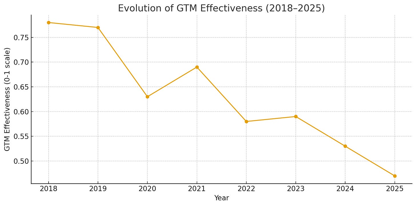Marketing decline is additive. Sales decline is multiplicative. That’s why GTM effectiveness has not simply declined — it has accelerated downward.